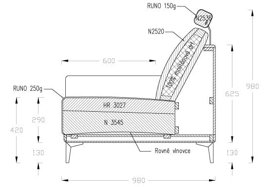 ŘEZ SEDAČKOU Sedačku NEW EXTENT tvoří nejkvalitnější materiály jako masivní bukové dřevo, smrkové dřevo, překližka a DTD. Pěna o vysoké hustotě zase zaručuje stálost tvaru i vysoký komfort sezení. Výplň alternativně mohou tvořit i taštičkové pružiny, které jsou rovněž vysoce odolné a trvanlivé.